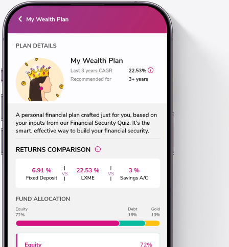 Welcome to Lxme, where your financial well-being is our top priority. We understand the importance of safeguarding your money, and that’s why our platform is meticulously designed to ensure 24×7 security. With Lxme, you embark on a journey towards financial empowerment, guided by a team of experts dedicated to curating mutual fund investment plans tailored to meet your unique needs. Lxme is your one stop shop for all investments for women.